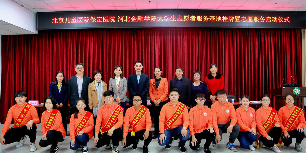 18日上午,经过前期的沟通交流和精心筹备,大学生志愿者服务基地挂牌暨志愿服务启动仪式正式举办。河北金融学院党委副书记刘文艳、河北金融学院国际教育学院党总支书记尹晓菲,河北金融学院团委副书记田钰莹,保定市卫计委团委书记董占马,北京儿童医院保定医院院长田剑、党委书记刘跃军、工会主席许静等领导参加了启动仪式。