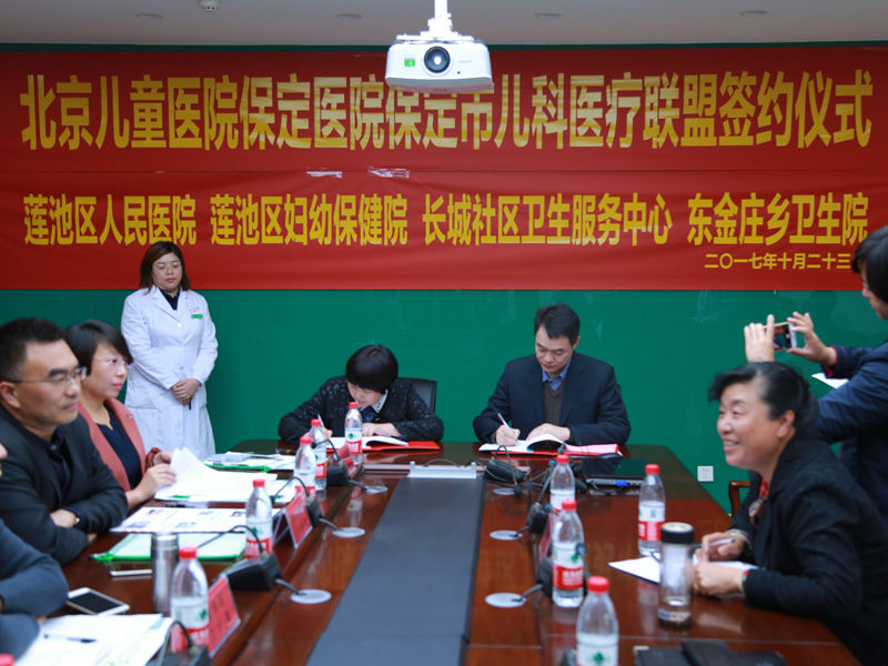 10月23日,恰逢党的十九大召开之际,北京儿童医院保定医院儿科医疗联盟签约仪式在行政楼9楼会议室举行。继儿科医疗联盟成立以后,联盟范围继续扩大,莲池区人民医院、莲池区妇幼保健院、长城社区服务中心、东金庄乡卫生院四家医院也加入到保定市儿科医疗联盟的大家庭。