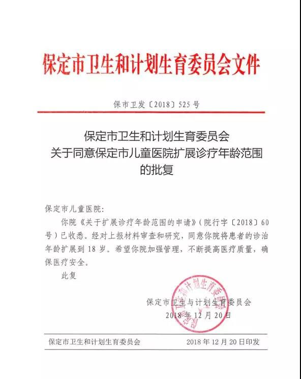 △保定市卫计委关于同意保定市儿童医院扩展诊疗年龄范围的批复