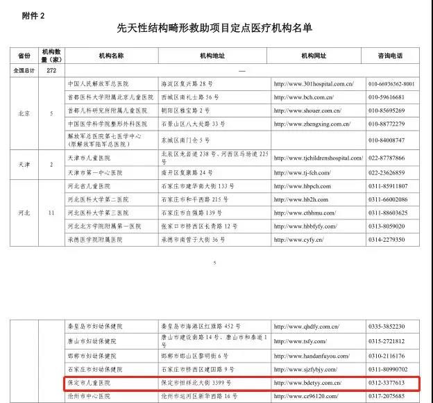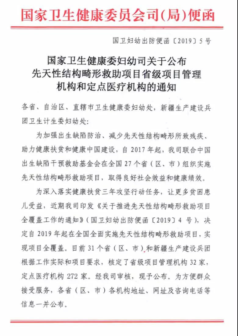 为减少先天性结构畸形所致残疾,提高出生人口素质,进一步加强出生缺陷防治,使更多贫困患儿家庭受益。1月30日,国家卫生健康委妇幼司发布了《关于公布先天性结构畸形救助项目省级项目管理机构和定点医疗机构的通知》,我院获批成为河北省先天性结构畸形救助项目定点医疗机构之一。据悉,此次河北省共有11家定点医疗机构入选,保定市儿童医院是全市唯一获批的市级定点医疗机构。