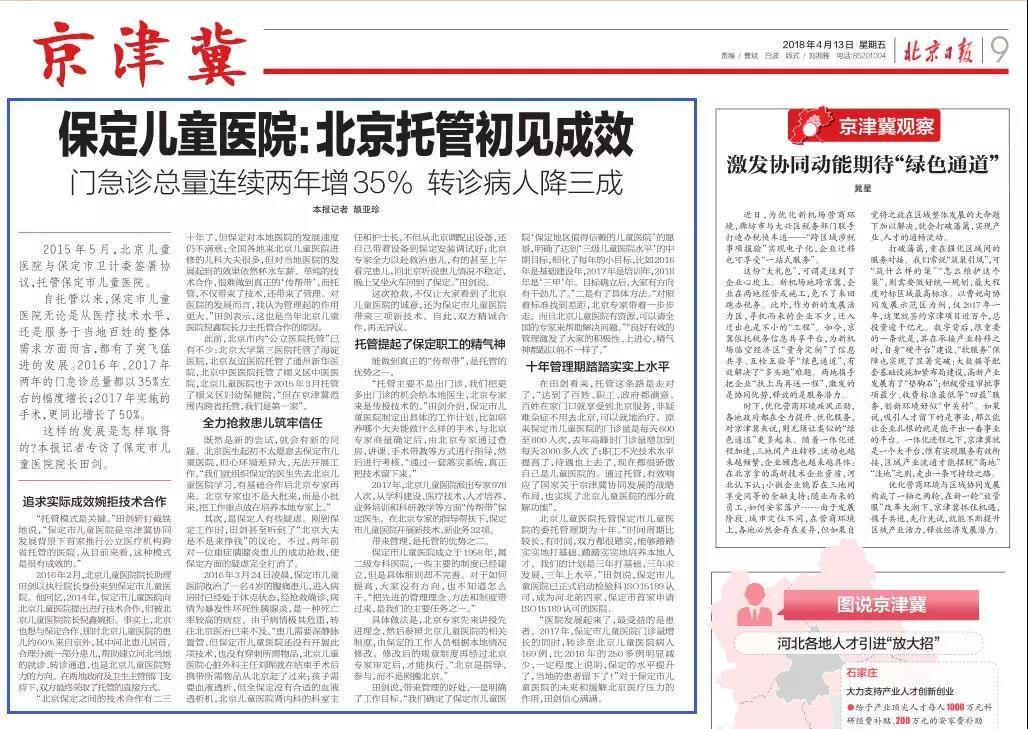 “托管模式是关键。”田剑斩钉截铁地说,“保定市儿童医院是京津冀协同发展背景下首家推行公立医疗机构跨省托管的医院,从目前来看,这种模式是很有成效的。”