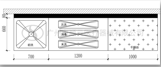 台面主要分为清洗槽,规格约为:0.7m×0.66m,三连槽(初洗,次洗,末洗),外径:长1220mm××宽660mm深135mm,干燥台尺寸约为:1m×0.66m