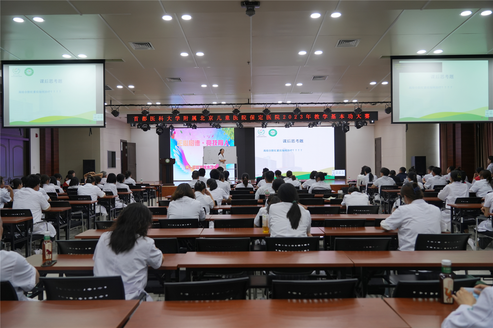 此次参赛内容包括教案书写和课堂理论授课现场展示两部分。经过前期教案书写评比,角逐出30名优秀教师进入课堂理论授课展示环节。初赛期间,作为评委的北京儿童医院教学专家王大勇主任、张克青主任、蒋也平主任针对每位参赛选手的表现给予了中肯的评价与建议,10名教师最终入围决赛。