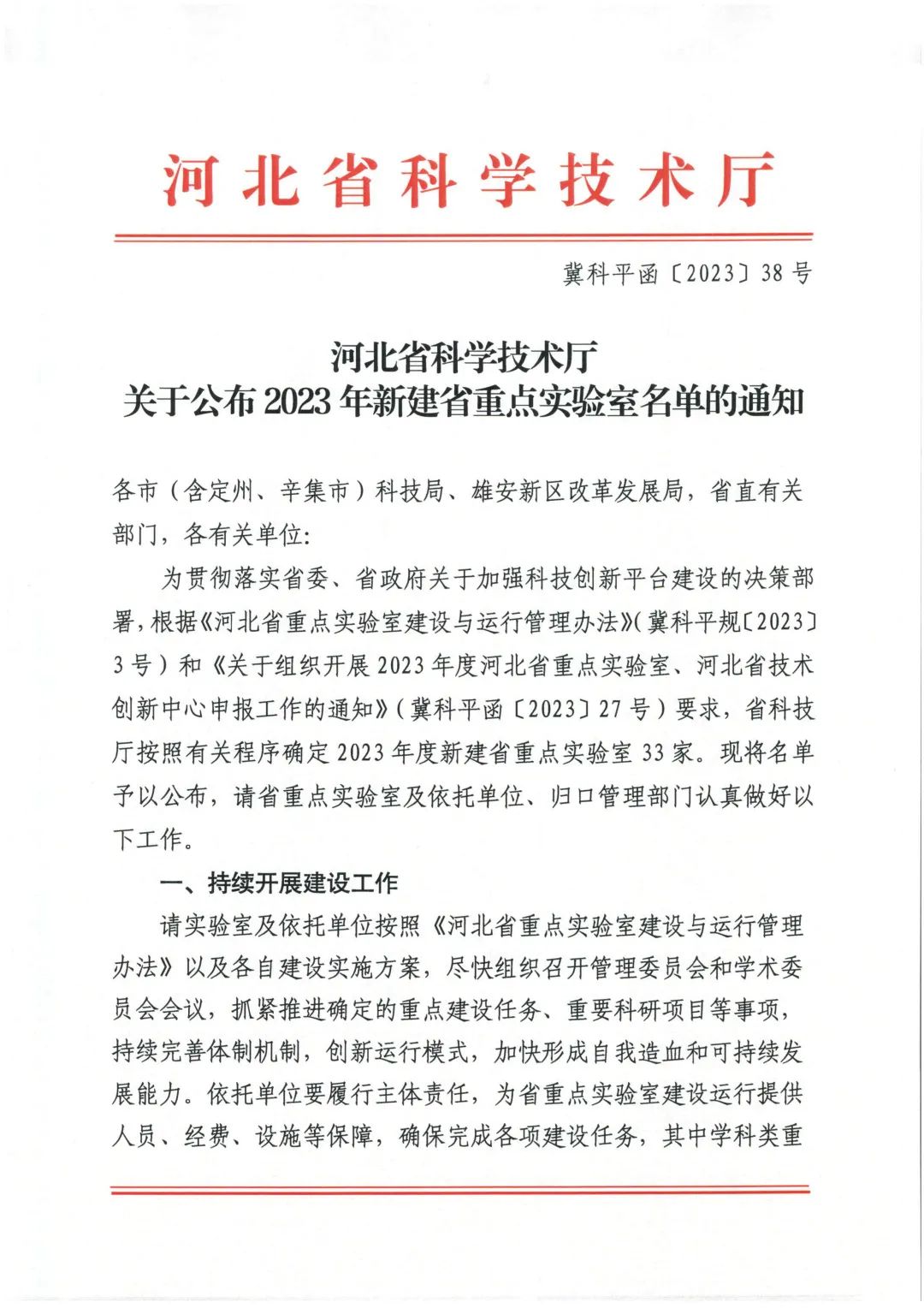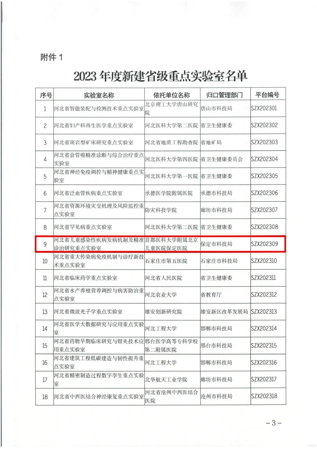 12月12日,喜报传来!河北省科学技术厅发布《关于公布2023年新建省重点实验室名单的通知》,文件中公布批准33家省重点实验室获批筹建。其中,由北京儿童医院申阿东教授担任实验室主任,北京儿童医院保定医院副院长毕晶等为主要成员所组建的《河北省儿童感染性疾病发病机制及精准诊治研究重点实验室》成功获批立项,该实验室是我院建院以来首个获批建设的省级重点实验室,实现了在北京儿童医院保定医院获批国家儿童区域医疗中心背景下,省级重点实验室的“零突破”!对于医院科研平台建设发展有着重大意义。