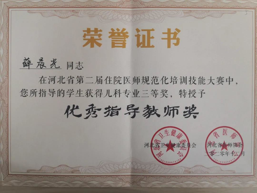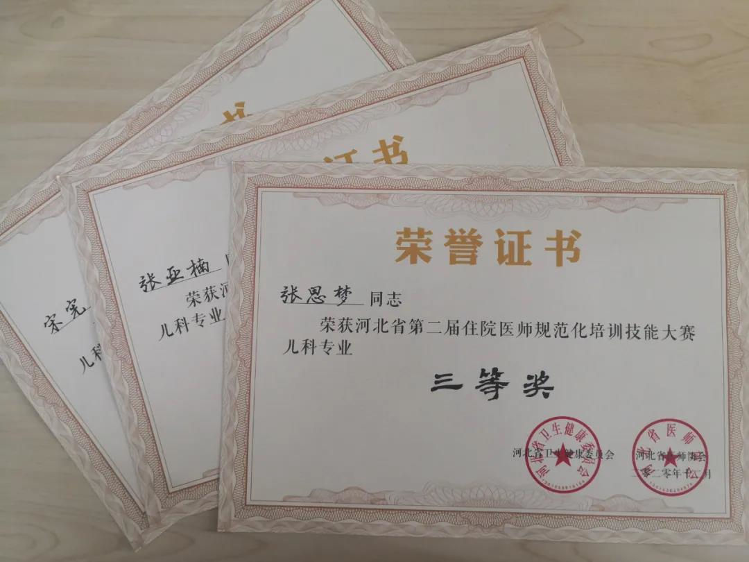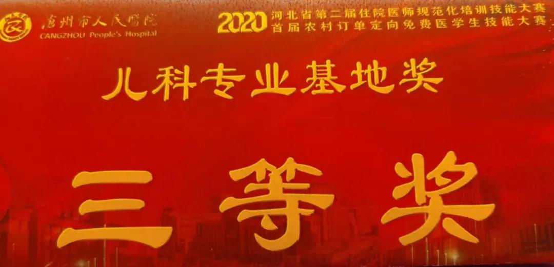 2020年12月,在河北省第二届住院医师规范化培训技能大赛暨首届农村订单定向免费医学生技能大赛中,我院选手凭借扎实出色的表现在全省强手如林的26支参赛队伍中脱颖而出,取得儿科住培学员全省第五名的好成绩,荣获儿科专业基地三等奖,并获得优秀指导教师奖。