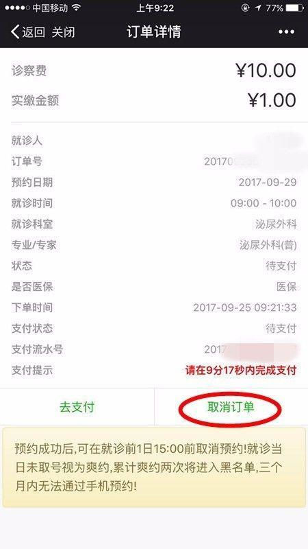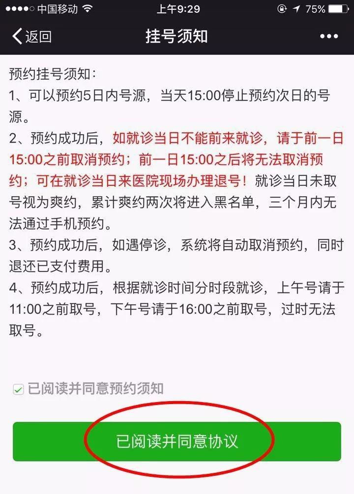 提醒:如不能在预约时段内前来就诊,可在就诊前1日15:00前取消预约,超过15:00后预约不可取消,且所缴费用无法退回。就诊当日未在预约时段内取号视为爽约,累计爽约两次将进入黑名单,三个月内无法通过手机预约。