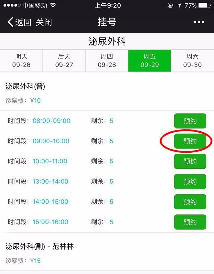 ②选择挂号科室,进入挂号预约界面,默认显示未来5天的号源情况,请按照就诊时段预约。(以“泌尿外科”为例)