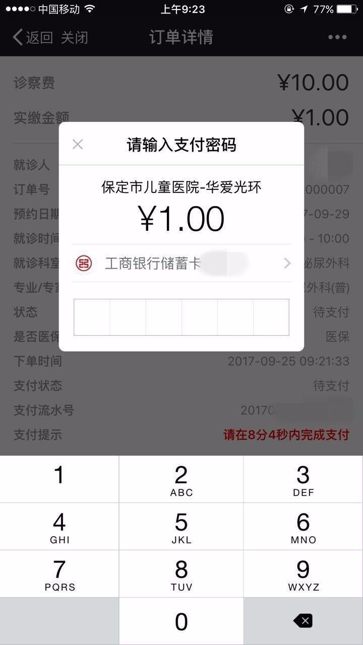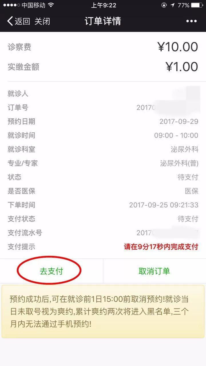⑥请在10分钟内支付,超时后订单自动取消,支付成功后将收到预约成功的短信提醒。