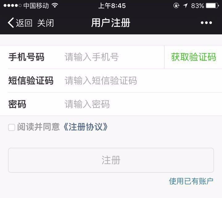 输入手机号、收到的短信验证码、自己设定的密码进行注册。
