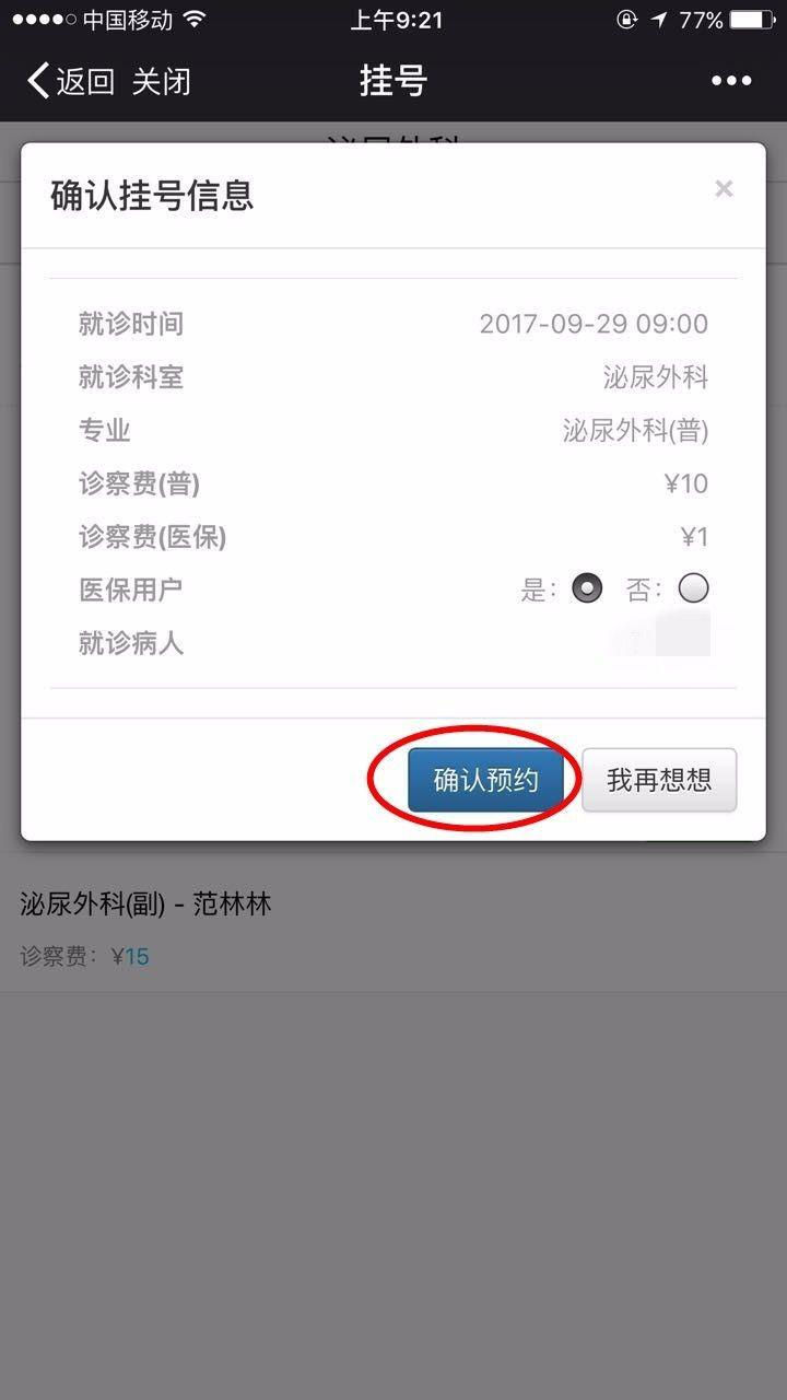 ④点击“预约”按钮,弹出“确认挂号信息”窗口,选择就诊病人,是否为医保用户,然后“确认预约”。