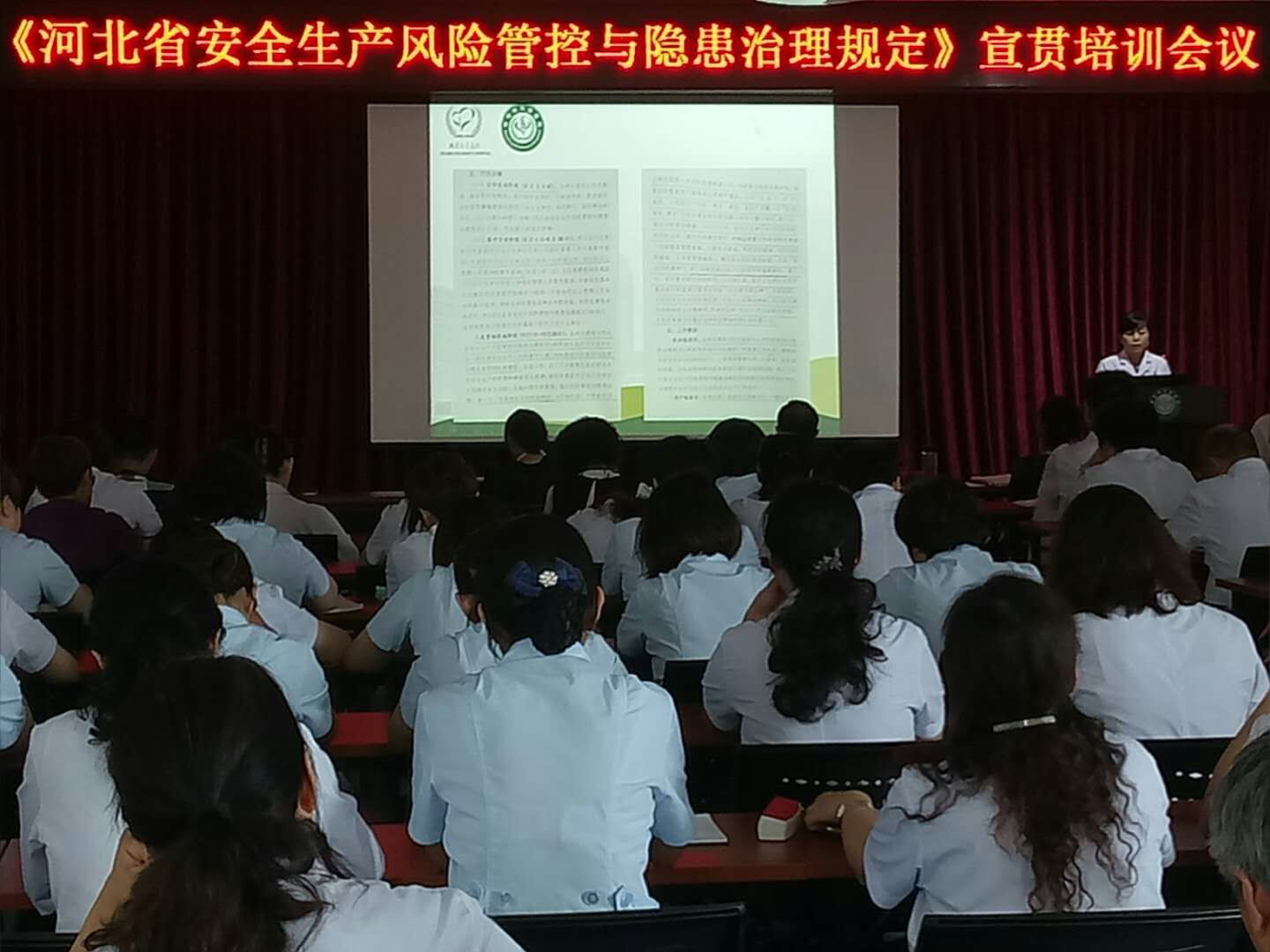 8月9日,医院召开《河北省安全生产风险管控与隐患治理规定》宣贯培训会议,会议传达落实了市卫计委办公室关于印发《宣传贯彻河北省安全生产风险管控与隐患治理规定活动实施方案的通知》文件精神,安全办负责人对《河北省安全生产风险管控与隐患治理规定》进行了宣讲培训院领导及全体中层干部参加了会议。《河北省安全生产风险管控与隐患治理规定》(以下简称《规定》)是全国首部省级政府层面规范安全生产领域风险管控和隐患治理的政府规章,于7月1日起正式施行。《规定》的颁布实施标志着我省安全生产风险辨识管控与隐患排查治理双重预防机制建设(简称"双控”)跨上了一个新的台阶。下一阶段,我院将以此宣贯培训为契机,抓好对医院各层面人员培训的同时,积极宣传,借助LED电子屏、院报、微信公众号等平台,开展多渠道、多层次的宣贯活动,把《规定》宣贯工作深入到每个部位、每位职工,保障我院安全生产形式持续稳定。